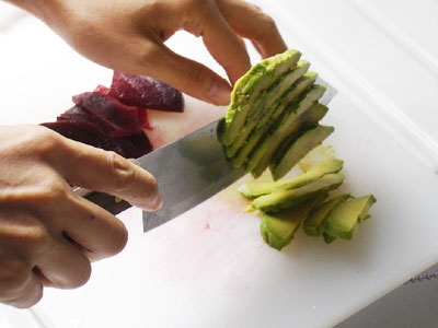 - アボカド、モッツァレラ、ベッタラーブはそれぞれ薄切りにします。
